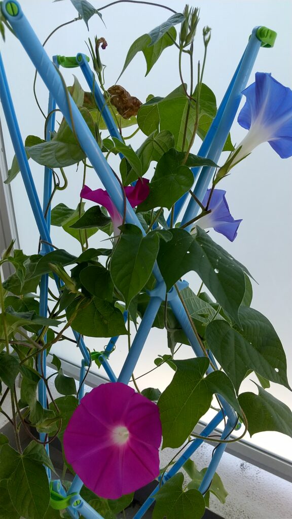 何十年ぶりかの朝顔です。暑い夏に涼やかな色の花が咲いています。