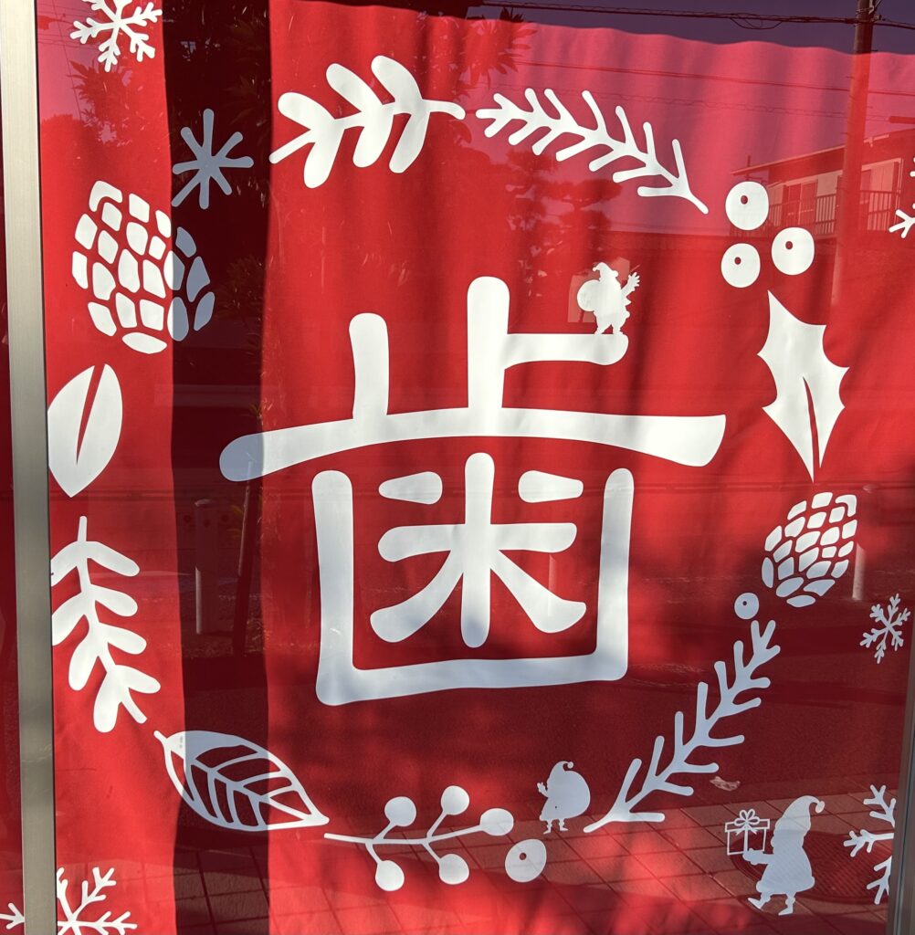 また、普段は道路から青の“歯”ののれんが見えますが、去年からクリスマスの時期限定で赤いのれんを飾っています。
